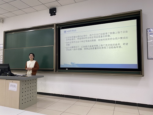 在报告中,张潇潇老师与到场师生着重探讨了在实际图像处理中,用户已经获得了图像上每个点处的弯曲情况,但希望获得符合特定弯曲现象的图像的方法。具体来说,已知部分曲面网格上每个顶点处的曲率,来寻找到一组CP-度量,使得这组度量恰好诱导了该组曲率值,涵盖了欧式、双曲、球面三种背景几何下,求解靶曲率所对应的CP-度量算法。张老师结合前期研究取得的成果,提出了具体解决方法。
