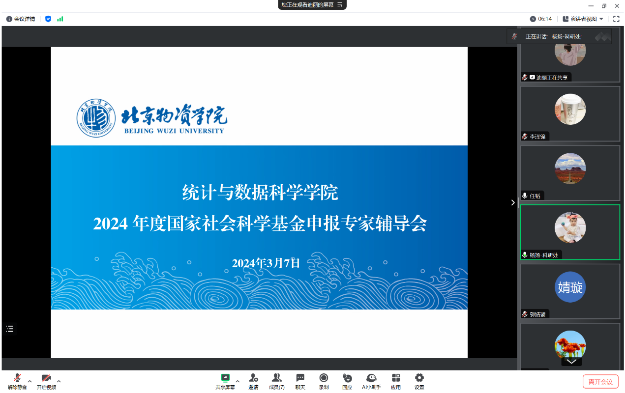 2024年3月7日,科研处联合统计与数据科学学院于线上举办了2024年度国家社会科学基金申报专家辅导会。本次辅导会邀请了首都经济贸易大学统计学院任韬教授作为辅导专家,与申请者进行一对一的交流和指导。学院申报2024年度国家社会科学基金的青年教师参加了此次辅导会,会议由科研处处长助理杨扬老师主持。