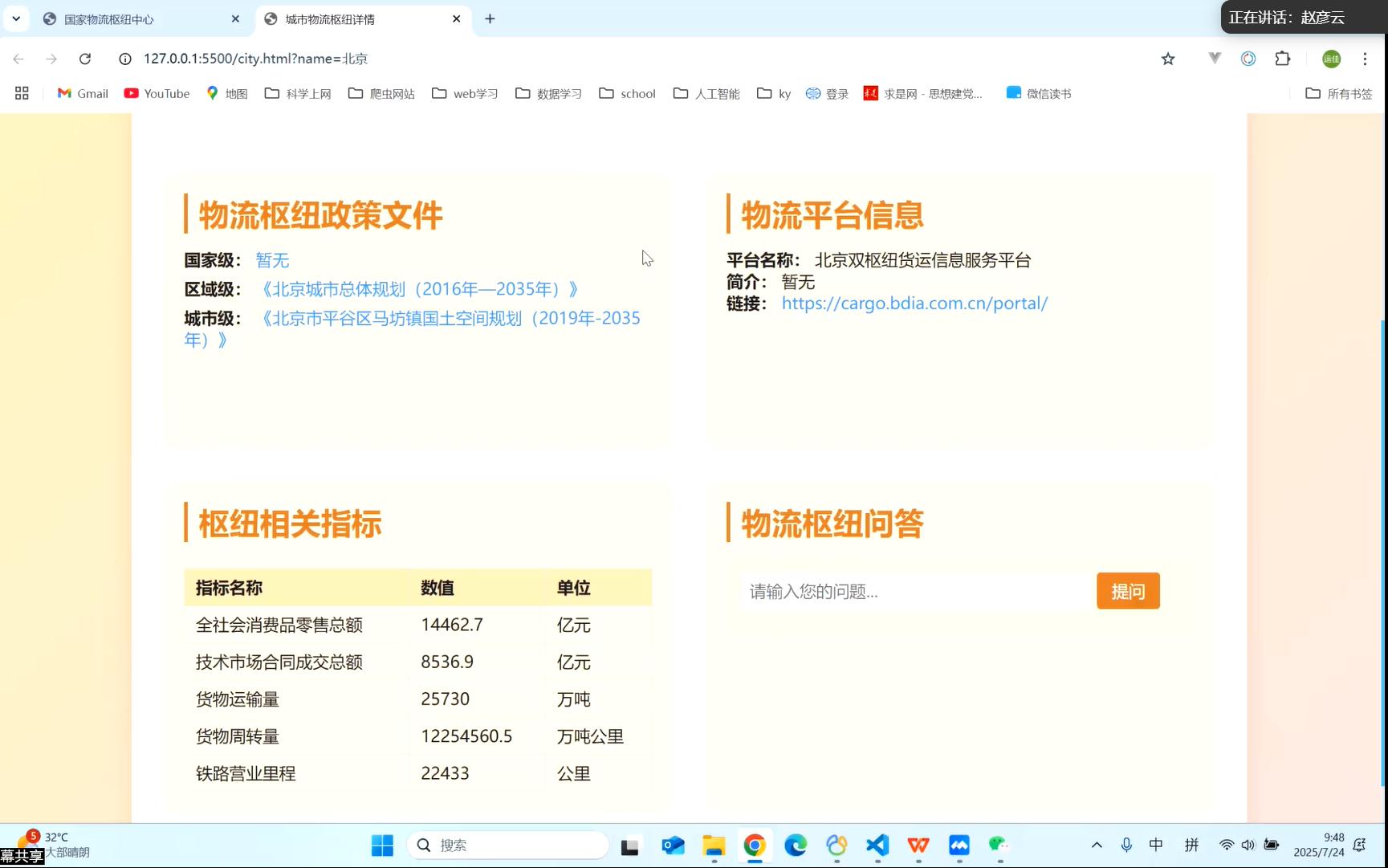 国家物流枢纽中心平台界面开发组:已初步完成平台主界面设计与响应式布局,优化了加载动画与页面切换效果,提升了流畅度与多端体验。成功集成ECharts实现核心指标动态可视化,并实现与数据文件实时对接。此外,进一步优化数据处理逻辑与前端性能,规范文件结构并完善文档注释,增强可维护性与协作效率。
