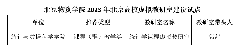 郭茜教授牵头的“统计学课程虚拟教研室”成功入选,教研室类型为课程(群)教学类。