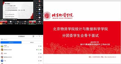 统计与数据科学学院分团委副书记、学生会主席团面试、分团委各部门部长竞聘面试、学生会各部门部长竞聘面试。担任本次竞选面试的评委有:统计与数据科学学院党总支书记续杨老师、统计与数据科学学院统计与数据科学学生党支部书记毕英乐老师、信息学院信管专业辅导员丁悦老师、统计与数据科学学院数据科学与大数据技术专业辅导员徐文彬老师,信息学院学生会轮值主席牛梦竹学姐和樊天雅学姐。
