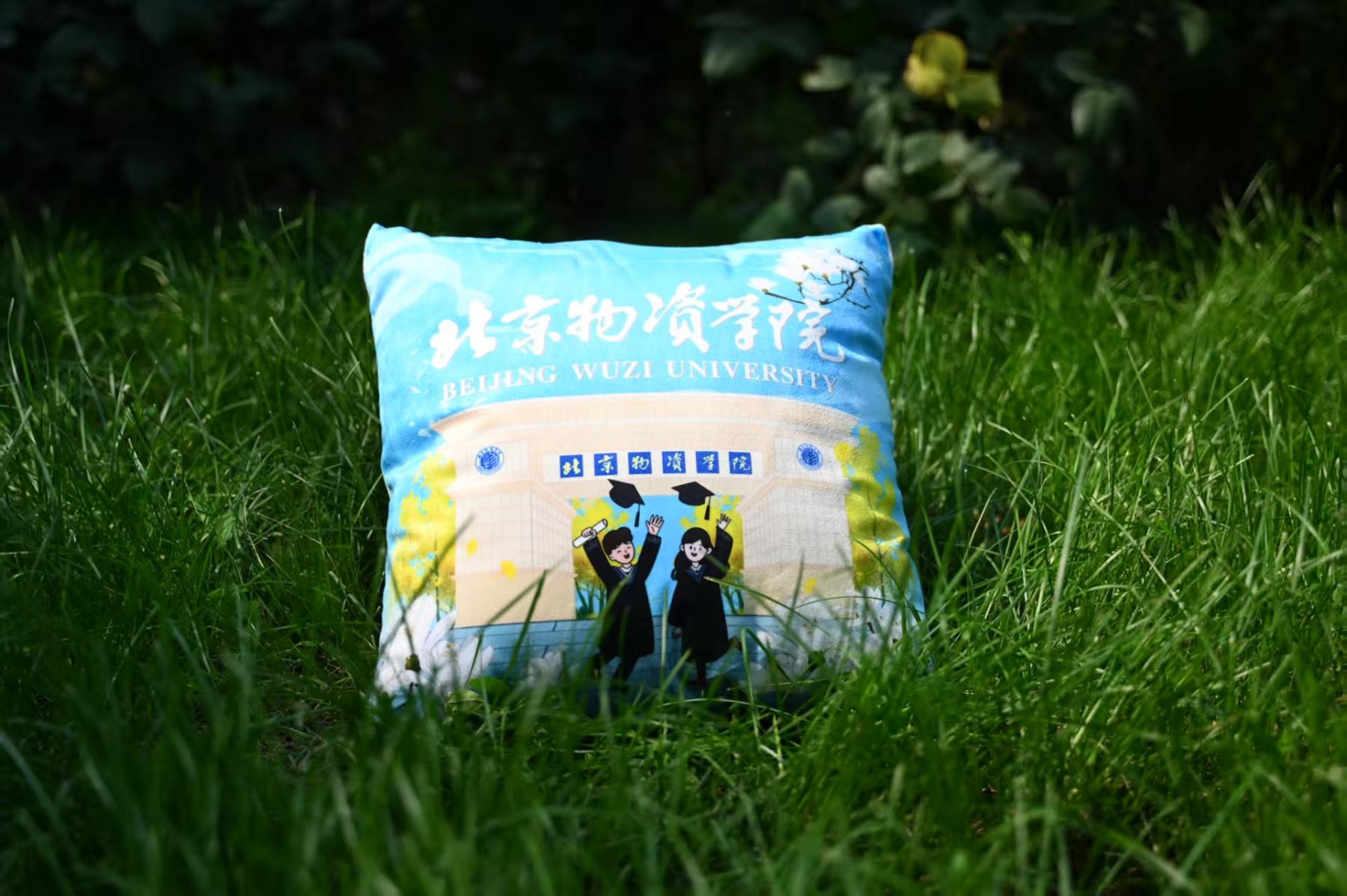 这款抱枕将北物的春秋冬夏都缝进了经纬之间。正面以玉兰的清雅、银杏的鎏金、校门的庄重为底色,勾勒出校园里最动人的风景:春日玉兰花缀满枝头,秋日银杏叶铺满小径,校门始终如一地守望每一个清晨与黄昏。背面则以校训石的沉稳与浪花的灵动为设计语言,恰似运河水波澜不惊却奔涌不息,既承载着学院对学子的期许,也寓意着你们即将跃入人海、逐浪前行的勇气。