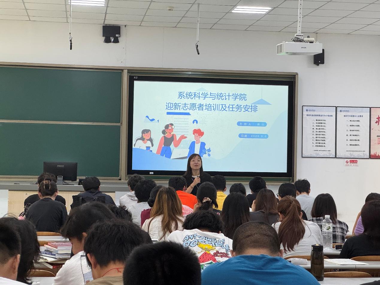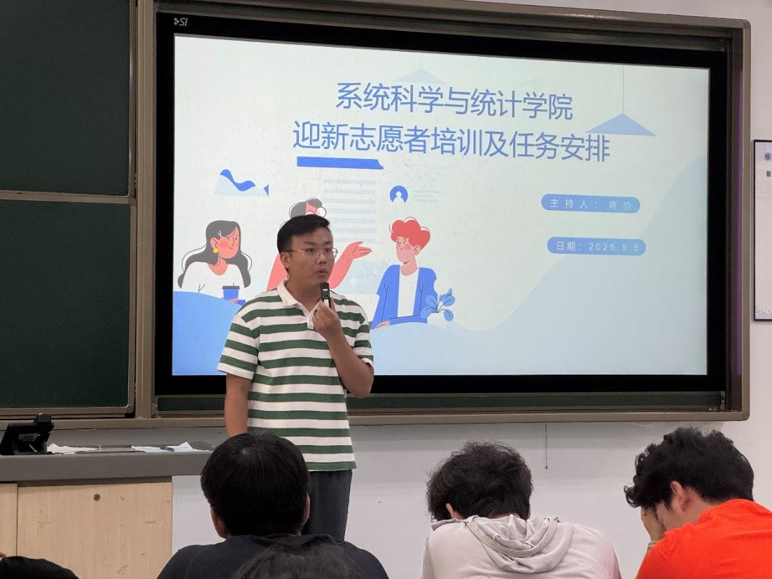 为确保2025级新生顺利入学,2025年9月5日上午九点 欧乐影视 在二教106开展迎新志愿者培训活动,学院党总支副书记甄姿老师、分团委书记徐文彬老师、2025级全体班导和44名志愿者出席本次培训活动,明确志愿工作要求、任务分工及注意事项,为迎新工作筑牢基础。