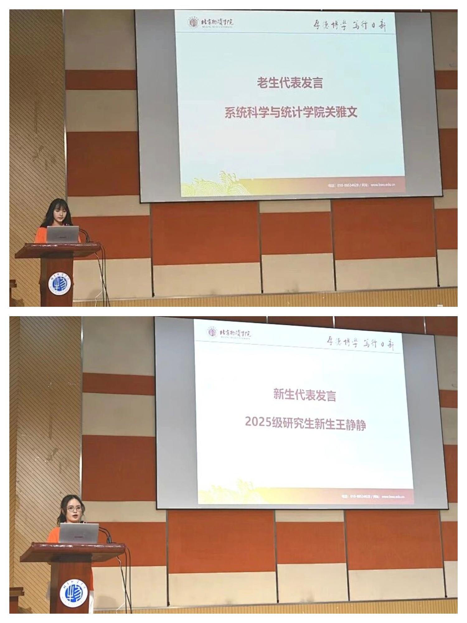 活动伊始,老生代表关雅文与25级研究生新生代表王静静先后分享经验。她们结合自身经历向新生提出建议,鼓励大家在大学期间确立清晰目标并坚持奋斗,勇于尝试新事物,积极参与实践活动与学科竞赛,珍惜宝贵时光,书写属于自己的青春篇章。