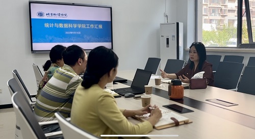 2023年9月15日上午,党委副书记宋晓欣到统计与数据科学学院调研指导工作。统计与数据科学学院党总支书记续杨、院长郭茜、院长助理韩嵩参加会议。